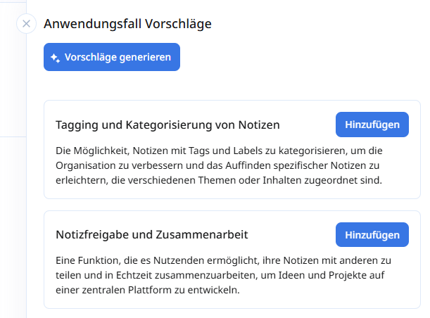 ii.Vorschläge generieren: Generiert KI-gestützte Vorschläge für Anwendungsfällen basierend auf den unter Übersicht hinterlegten Informationen und ergänzt durch das themenspezifische Stackgini Marktwissen zu den typischen Fragestellungen und Anwendungsfällen in Ihrer Initiative.