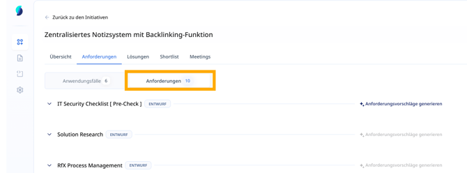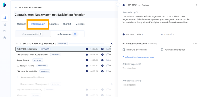 In Stackgini können Sie Anforderungen direkt innerhalb einer Initiative erfassen. Diese Funktion hilft Ihnen dabei, spezifische Bedarfe strukturiert zu dokumentieren – etwa für spätere Vergleiche oder Bewertungen von Lösungen und Anbietern und in der Zusammenarbeit mit Fachbereichen. Die Anforderungen werden im Reiter „Anforderungen“ innerhalb der Initiative verwaltet.