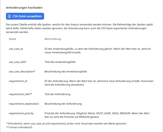 Laden Sie bestehende Anforderungssammlungen bequem per .CSV Import hoch.