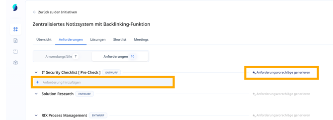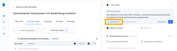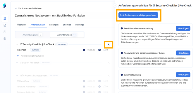 Sie können sich, analog zu Anwendungsfällen, auch hier KI-Vorschläge zu Anforderungen per Klick generieren lassen, die auf gleichem Wege angepasst werden können wie manuelle Einträge zuvor.
