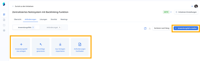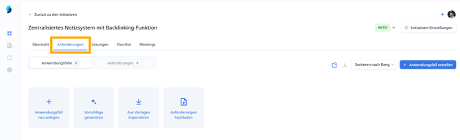 Um nun Anforderungen unter den Anwendungsfällen zu erfassen, navigiere Sie zunächst zum Reiter "Anforderungen". Hier sehen Sie zunächst eine leere Liste aus Anwendungsfällen, sofern Sie keine Vorlagen oder .CSV Uploads verwendet haben.