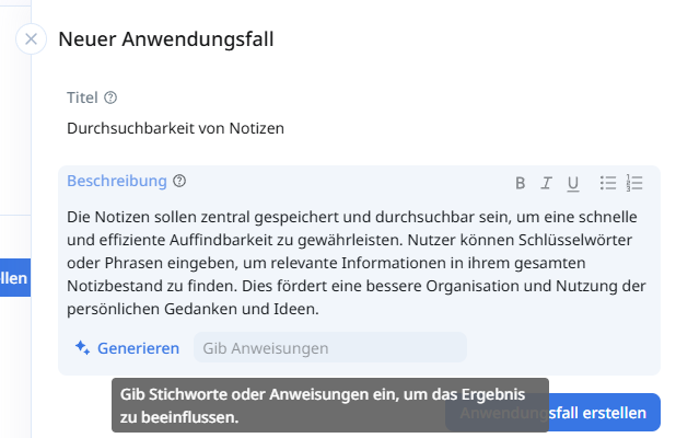 Anwendungsfälle sollten immer eine Beschreibung enthalten. Diese können Sie bequem KI-unterstützt erstellen lassen, manuell anpassen oder mit der "Gib Anweisungen"- Funktion die Auto-Vervollständigung der KI beeinflussen.