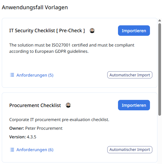 iii. "Aus Vorlage importieren": Bestehende Vorlagen, also wiederkehrende Anforderungssammlungen können per Klick importiert werden.