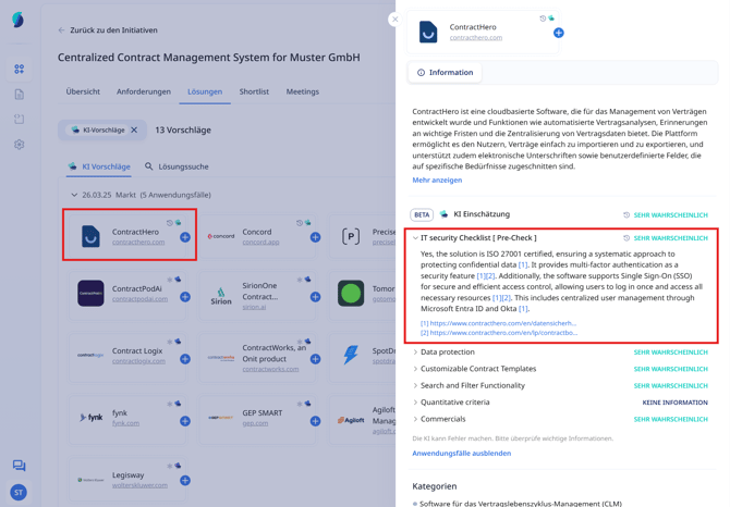 Das Ergebnis ist eine übergreifende KI Einschätzung für Ihre Bewertung je Lösung.