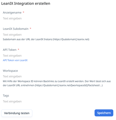 In der Maske „LeanIX Integration erstellen“ geben Sie folgende Informationen an:
