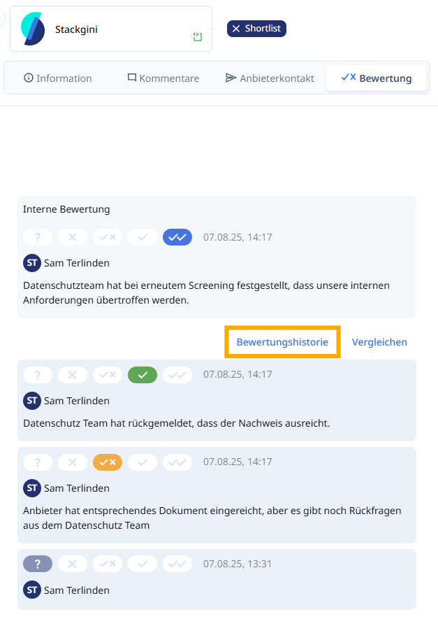 Die Historie zeigt chronologisch alle Änderungen und ermöglicht so eine lückenlose Nachverfolgung der internen Bewertungen, etwa bei Abstimmungen im Team oder späteren Rückfragen aus Fachbereichen wie IT Security, Datenschutz oder Einkauf.