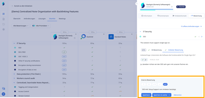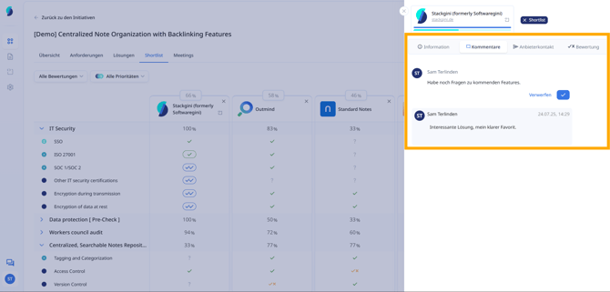 In der Bewertungsansicht haben Teammitglieder die Möglichkeit, über ein Kommentarfeld interne Hinweise oder Rückfragen zu ergänzen. Diese Notizen sind nur intern sichtbar, werden niemals mit Anbietern geteilt und unterstützen die gemeinsame Entscheidungsfindung.