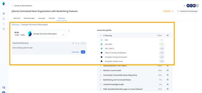 In Meetings, können Sie unter „Meetings“ Inhalte zu verknüpften Anforderungen und Bewertungen direkt pro Anbieter festhalten. So bleiben Sie im Termin mit dem jeweiligen Anbieter alle relevanten Daten im Blick.